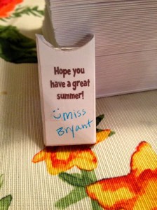 First, my goodbye presents to my students were something I felt like I absolutely had to do. My students have challenged me and grown me in ways I cannot even begin to describe. These little treats serve as a quite inadequate “thank you”. Via Pinterest, I found this adorable little craft (originally from http://lisastorms.typepad.com/lisa-storms/2011/05/end-of-school-treat-for-classmates-with-printable.html#comments).