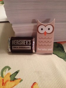 First, visit http://lisastorms.typepad.com/lisa-storms/2011/05/end-of-school-treat-for-classmates-with-printable.html#comments to download the “Owl Miss You” template pdf. Next, insert however many sheets of white card stock paper you need to make one for each student (I printed 20 sheets for my 158 students).