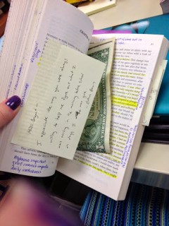 | My cooperating teacher (bless her soul) knows how sentimental I am. She cleverly commandeered my A Tale of Two Cities and Frankenstein book and my students put money and personal notes all over them!!!!! |