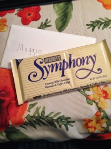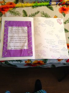 After lunch, I was blown away by the outpouring of love from my Honors students!!! In both classes my kids surprised me with cards and games and food (gluten free!) and books filled with personal notes! Both classes went in together and gave me a guillotine necklace (ask me for the nerdy yet adorable backstory in person)!!! One class even had a piñata! 🙂