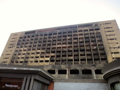 | A burned building just outside the Egyptian Museum from the revolution. The government wanted to renovate it, but the people fought to keep it as is as a reminder of the revolution. |